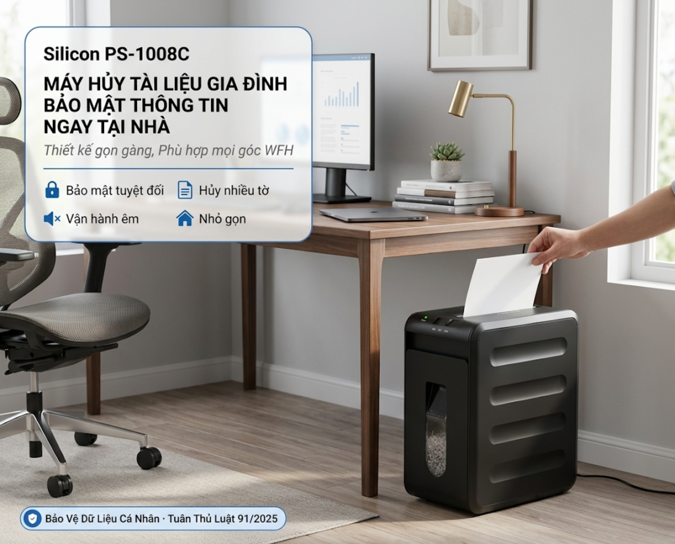 Máy hủy tài liệu gia đình Silicon PS-1008C phù hợp với không gian làm việc WFH.